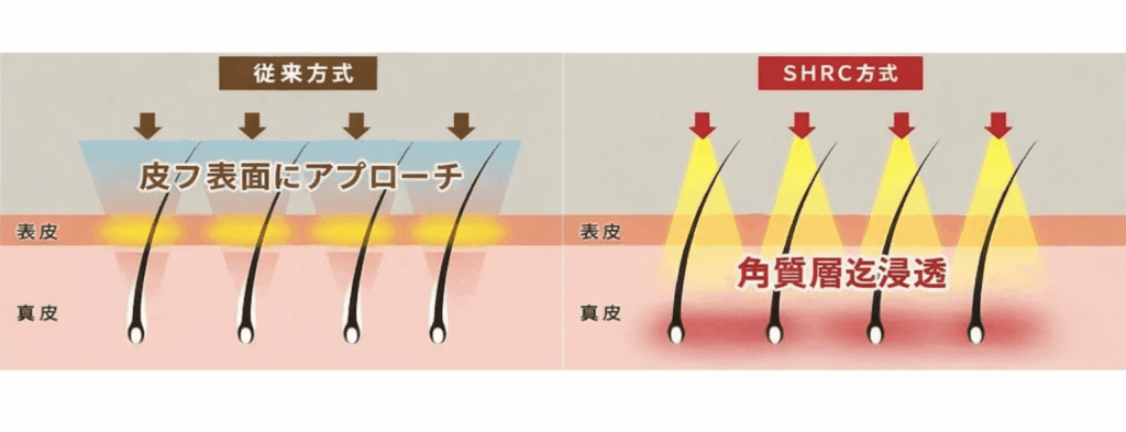 SHRC(Super Hair Removal Cooling)は、従来の脱毛技術とは異なり、熱エネルギーを使用して脱毛を行う革新的な方法です。この技術では、低エネルギーの光を高頻度で連続照射することで、ムラのない効果的な脱毛が可能です。光の出力を一定に保ちつつ、連続稼働が可能なため、短時間での施術が実現します。