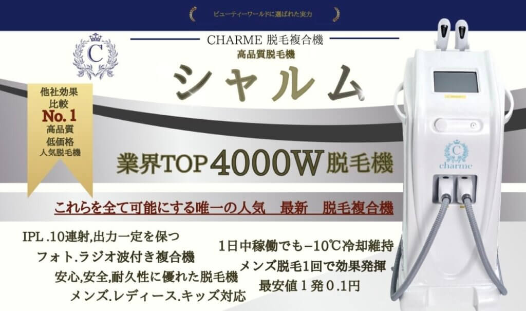 脱毛機導入時にサポートがありますが其々メーカーにより様々です。本体代にサポート費用をかなり上乗せされているメーカーやサポートが一切無いメーカーもあります。本来見落としがちな本体費用について適切なのかを検討するべきです。サポートによってサロンが作用されるとは限りません。サポートのみで繁栄していくのであれば、脱毛機メーカーの中古は多く目回らないと言う事で。ですが初期、サポートは無料で必要にはなります。勿論初回サポートを無料でしてもらいそこからはオーナー様の実力になります。初回サポート後も不明点は勿論出てきますがシャルムでは後のサポートは常ねにさせて頂いております。初めてサロンをする方や、お客様のお肌知識が無い方でも安心してスタート出来るサポート体制をさせて頂いております。勿論、機器の販売だけの方がサロン運営についてサポートではなく、実質、サロン運営をし経験してきたノウハウ等をスタッフがしっかりとサポートさせて頂いております。