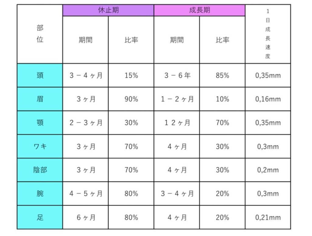 業務用の脱毛機は強力な照射によって毛の毛根にアプローチしていきます。IPL脱毛では毛のサイクルや部位により照射間隔期間は異なります。下記の図面の様に毛のサイクルに合わせてお手入れしていく事が重要です。部位によって減るっていく率も違う事がわかります。又再生する毛の量も違う事が明確ですね。この期間や理論を理解しお手入れしていく事が必要です。SHR脱毛に関しては毛のバルジ領域にアプローチしていきます。照射間隔は2週間に1度となります。最適な熱量と適した施術ですと目安は8回から10回程度です。(個人差にもよります)