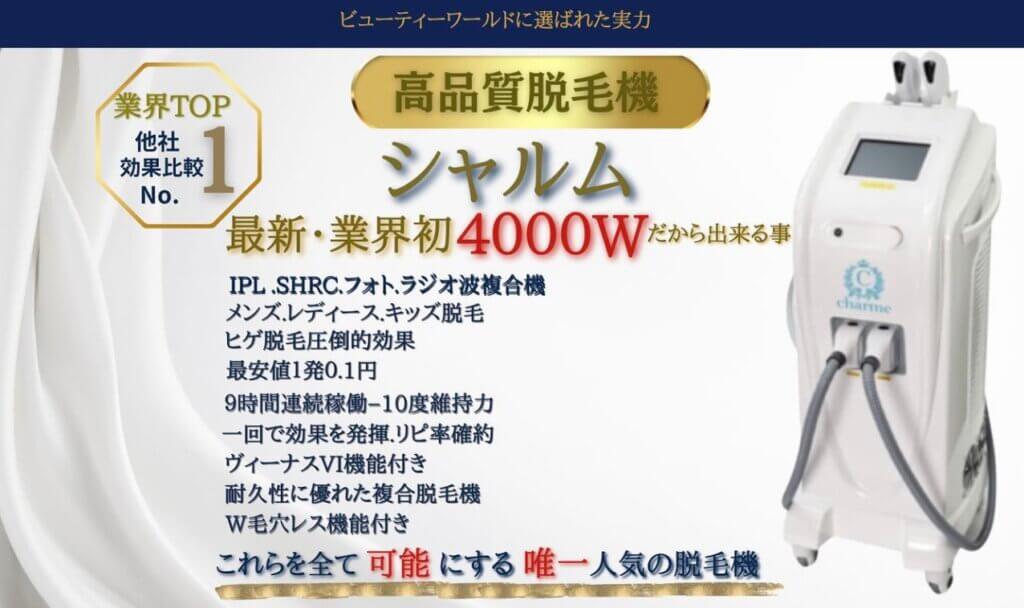 IPL.SHR式、業務用脱毛機では、脱毛効果を出す為に必要とする部品があります。全ての業務用脱毛機にその各部品が備わっている訳でもありません。部品が備わっていて本来、必要とする容量も重要になります。購入時には効果があったのに使用し半年足らずで脱毛効果がなくなってきた。お客様から3回目、4回目と段々抜けが悪いとお声がかかる様になった。の事で脱毛機を買い替える方が多いです。何故この様な事が起こるのでしょうか?脱毛機に必要としている部品、容量不足の問題です。脱毛機の容量不足で稼働し続けると、勿論、部品に負荷がかかり、劣化は瞬く間に起こります。その期間は使用頻度によりますが、半年から1年です。シャルム脱毛器はこの様な劣化を防ぐ事が出来ます。脱毛効果を最大限に発揮が出来、部品に負荷がかからず稼働が出来る唯一のハイスペック脱毛器です。何故シャルム脱毛器はここまでのスペックにこだわるのか!業務用脱毛機のメーカーの中にここまで費用をかけた脱毛機が存在していなかったからです。お客様への期待を裏切らない脱毛機!シャルム脱毛機は販売当初から今日までもご愛顧頂いております。又半数近くの方はシャルム脱毛機の部品、構造、仕様書を見て頂くのみで購入して頂いている方が多いです。何故なら他にない品質の脱毛機だからです。